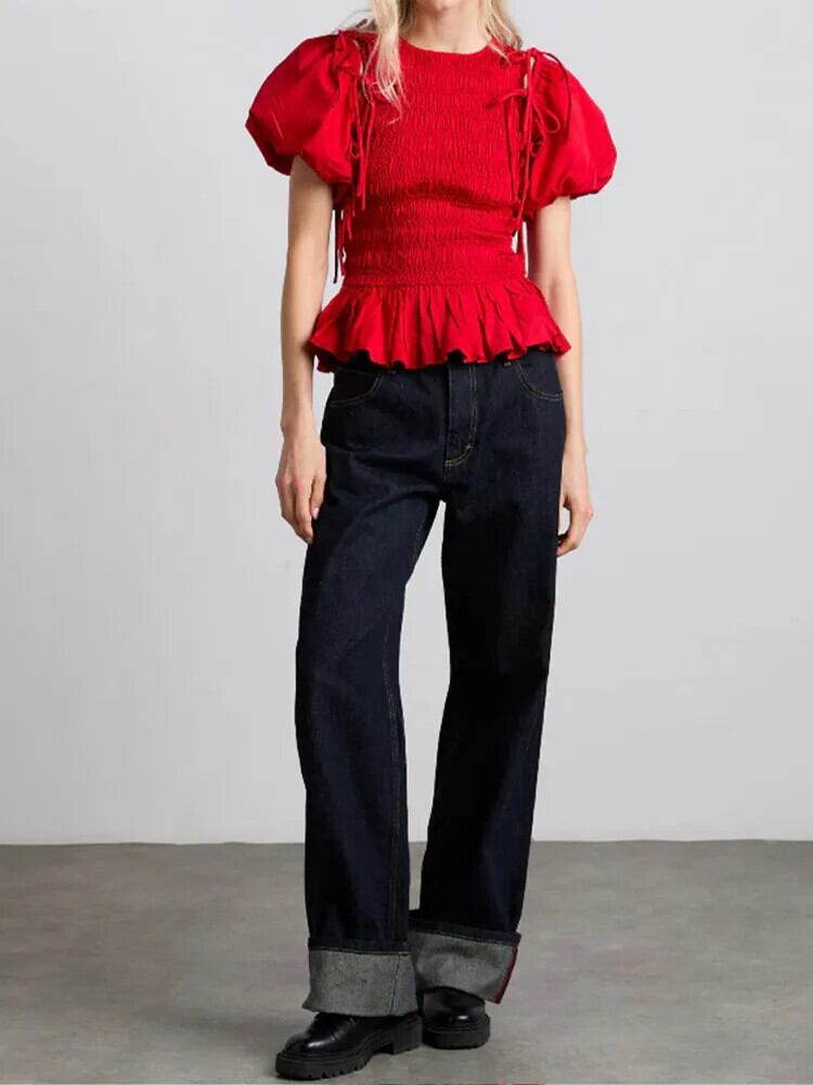 送料無料 e Frauen Solide Große パフ スリーブ Bluse Mode Rundhals Plissee Spitze Up Layered Lose Hemd 2025、Neue Weibliche Pendeln トップス レッド ソリッドカラー AE6776797661520197