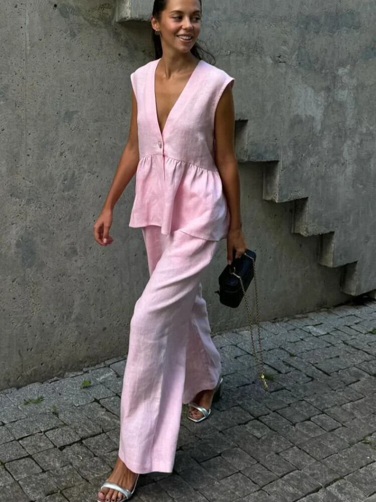 送料無料 Lose rosa Baumwolle Leinen 2-teliges セット Frauen Sommer Chic Outfit 2025 neue Mode ärmelloses タンクトップ mit hoher Taille weite Hosen セット AE6776748571529802 | 女性の為の通販サイト-fashion navi