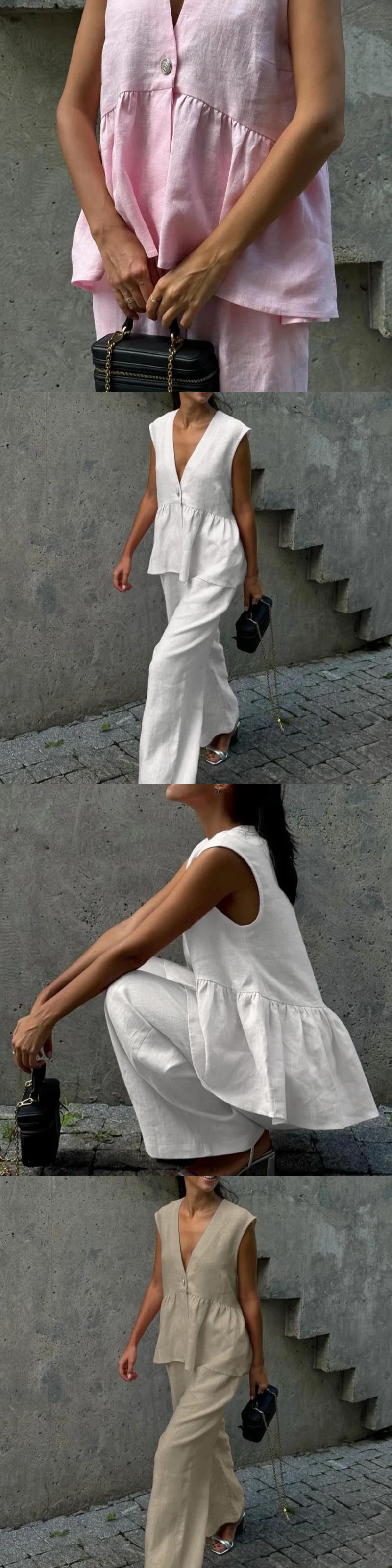 送料無料 Lose rosa Baumwolle Leinen 2-teliges セット Frauen Sommer Chic Outfit 2025 neue Mode ärmelloses タンクトップ mit hoher Taille weite Hosen セット AE6776748571529802