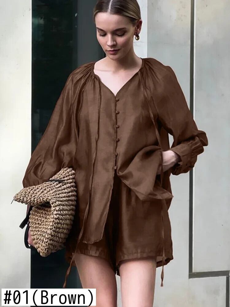 送料無料 サテン Lose Braun 2 Stück セット Frauen Solid Outfit 2025 e Weibliche Lange Hülse Hemd Hohe Taille ショーツ セット ブルマー ソリッドカラー AE6776717848617352