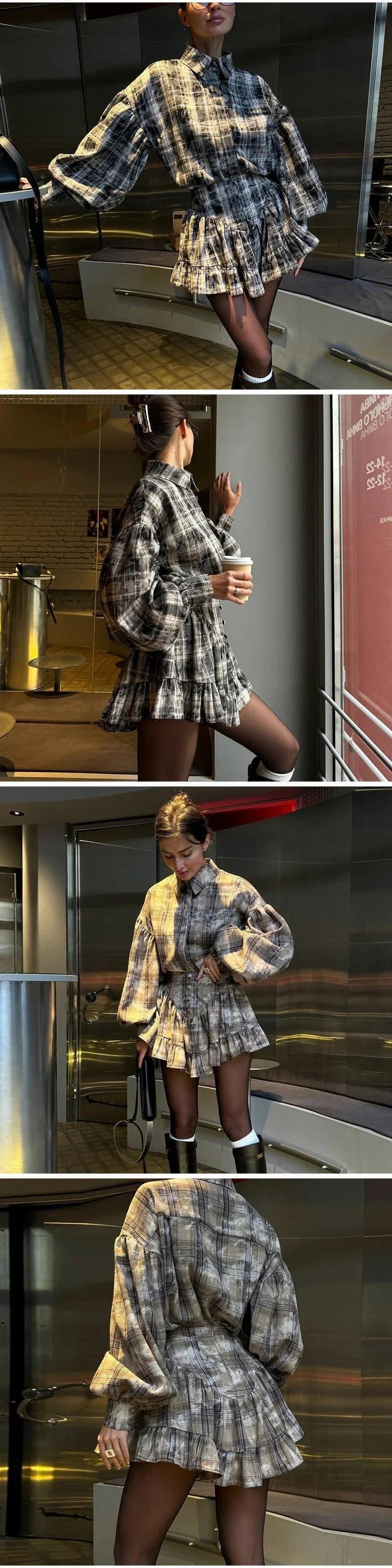 送料無料 Dunkelgraues Freizeithemd-Minirock-Set für Damen、Frühling、Sommer、Revers、karierte Bluse、volle Ärmel、Röcke、Anzug 2025、weibliche Mode-Outfits AE6776776782363831