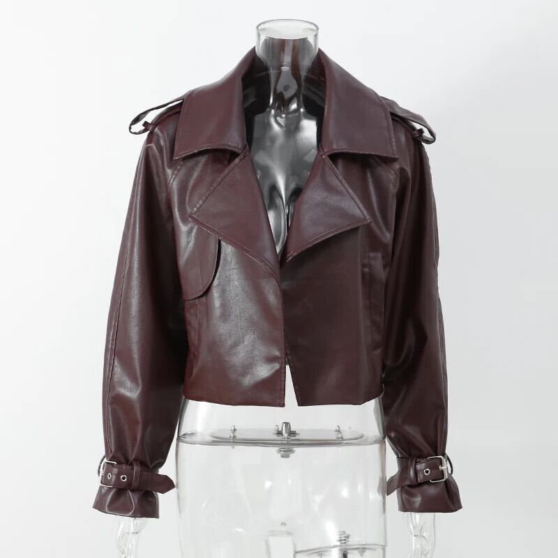 送料無料 Mode schicke feste Revers Lederjacke für Frauen lässig los Taschen Langarm Mantel 2024 Herbst Dame Street Oberbekleidung ストリート AE6677600887049799551469