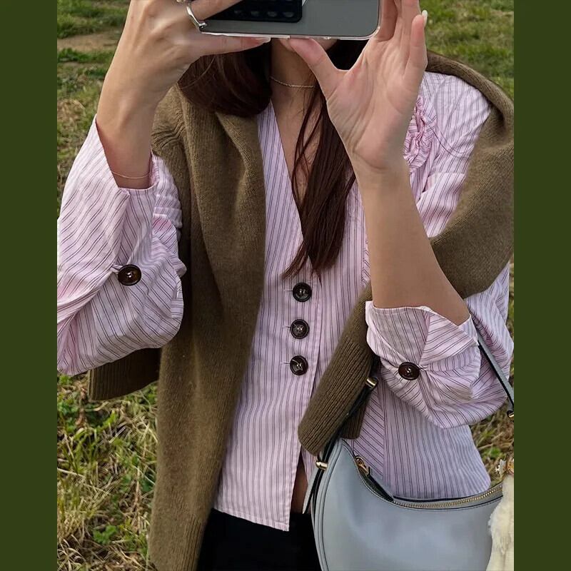 送料無料 Neue V-ausschnitt 3d Blume Lange Ärmeln frauen Hemd Einreiher Gestreiften Rosa Top 2025、Frühling Weibliche Bequeme Bluse AE667760088702699318036