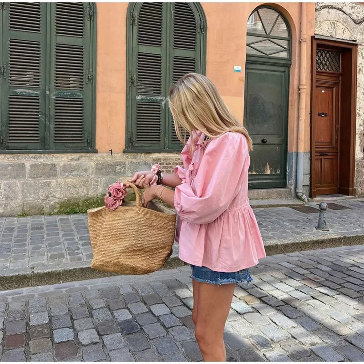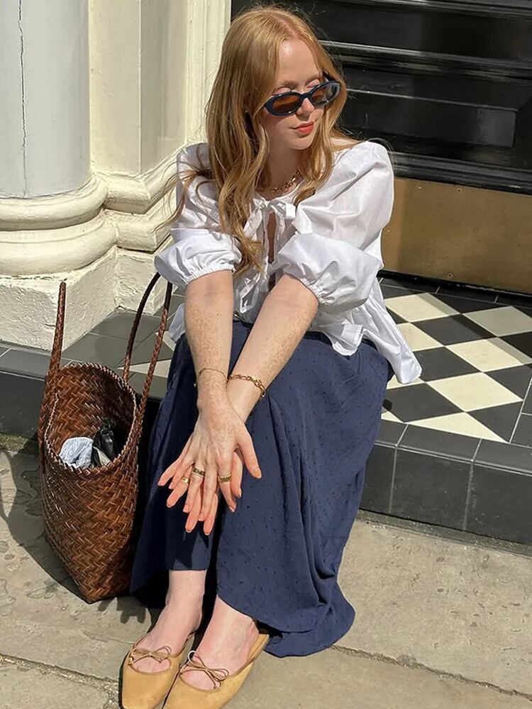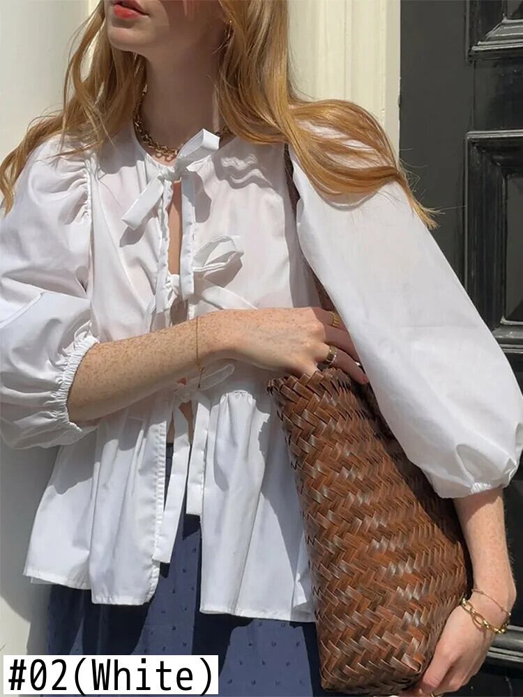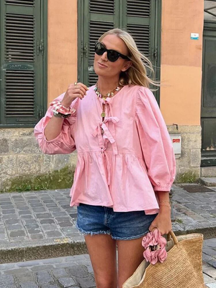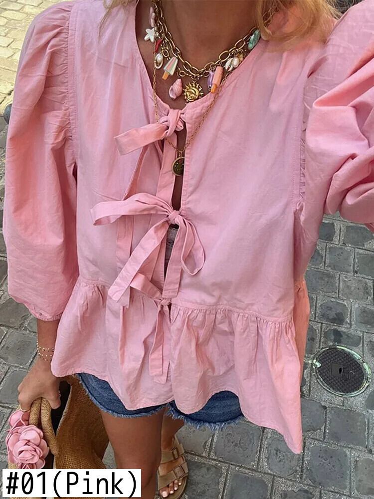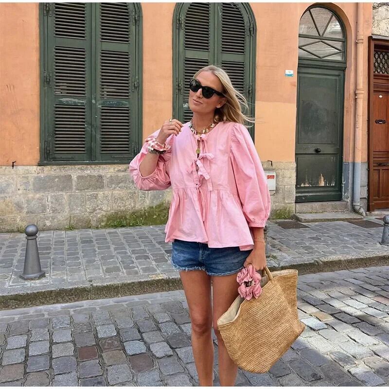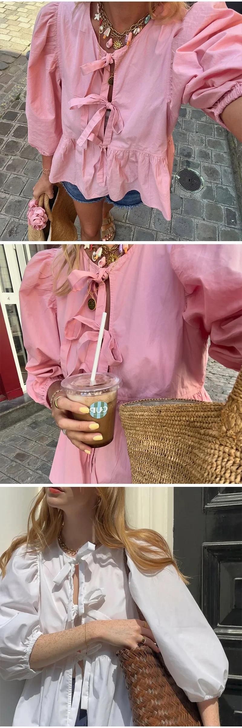 送料無料 2025 Nieuwe Lente Zoete Roze Bladerdeeg Half Mouw トップス Vrouwen e Holle Boog レースアップ ズーム ブラウス Vrouwelijke O Hals Hoge ストリートウェア AE6677600887075560586690