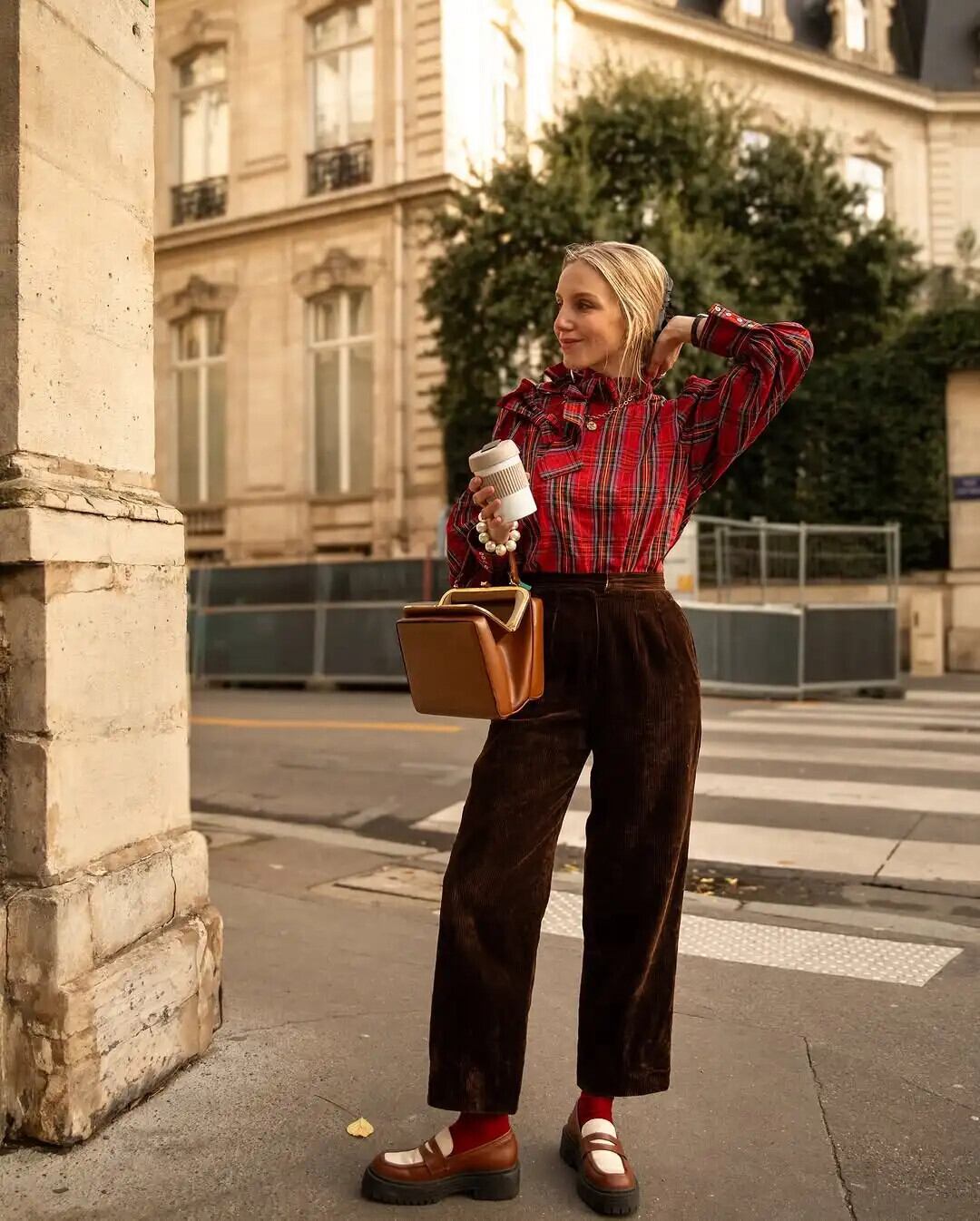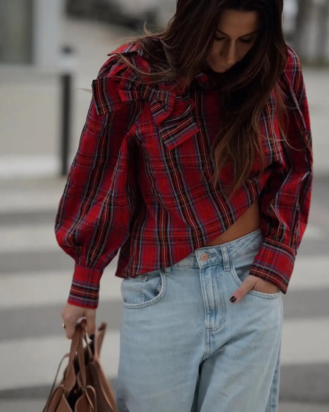 送料無料 2025、Damen-Hemd mit rot karierter Schleife、エレガント、Puffärmel、Stehkragen、Rüschenbluse、schick、Damen、neues -Street-Freizeit-Top mit Knöpfen ストリート AE6677600887048924415259