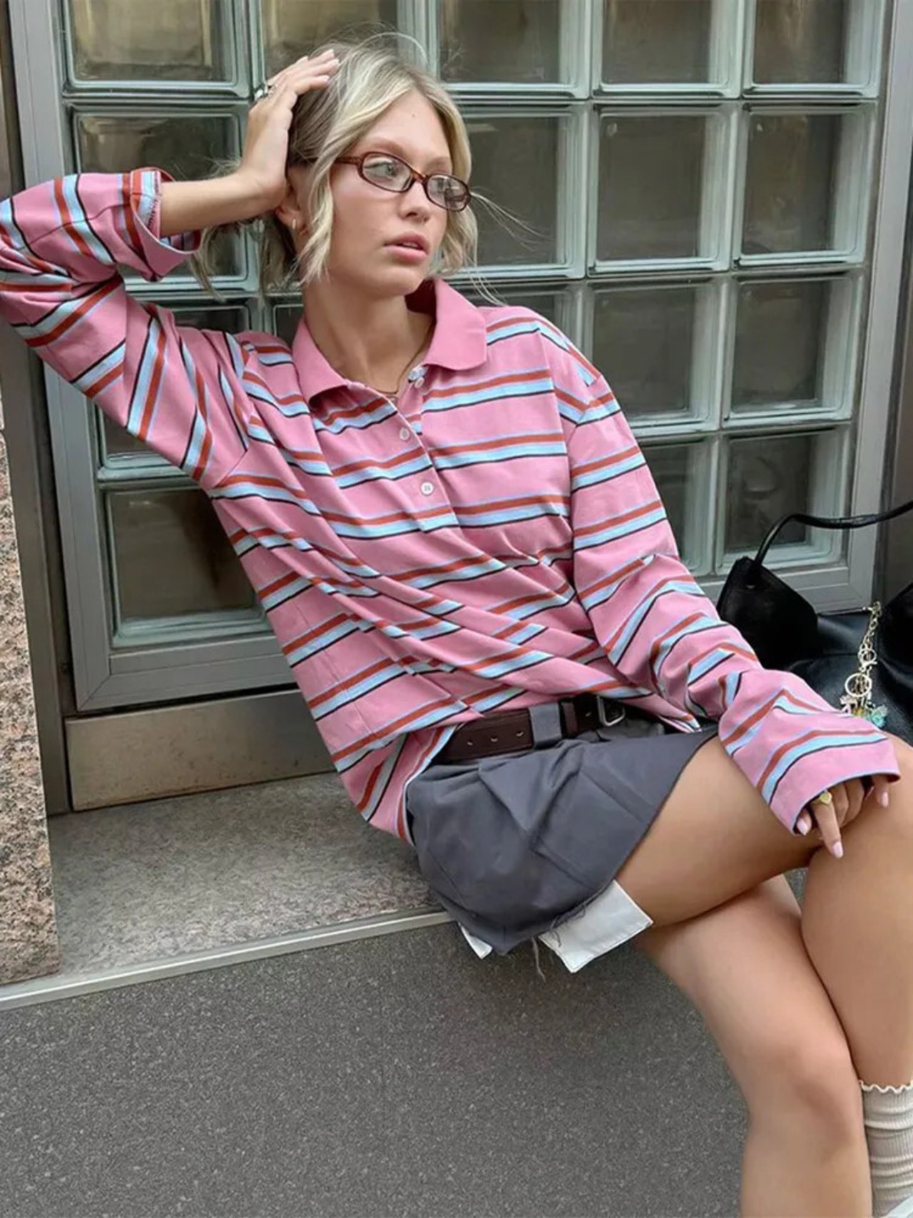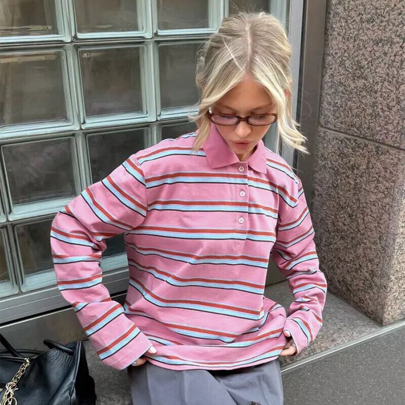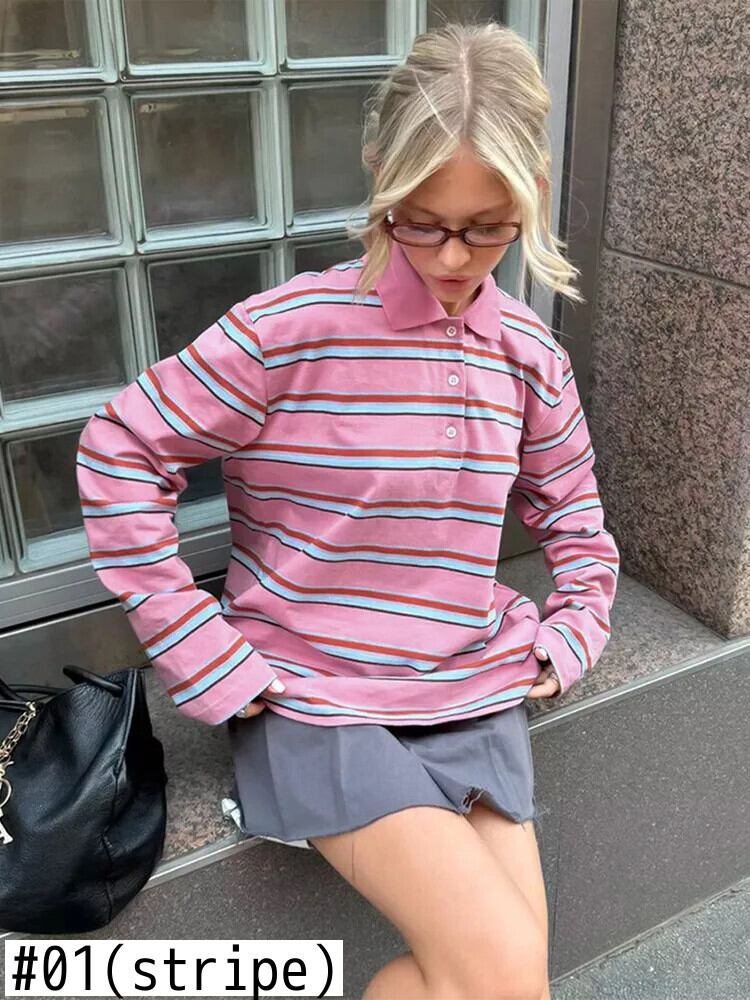 送料無料 Lässiges、kontrastfarbenes、gestreiftes Damen-Langhemd、ロッカー Revers、langärmelige Knopfbluse、2025、neues schickes -Street-Pendler-Top ストリート AE6677600887030260166416