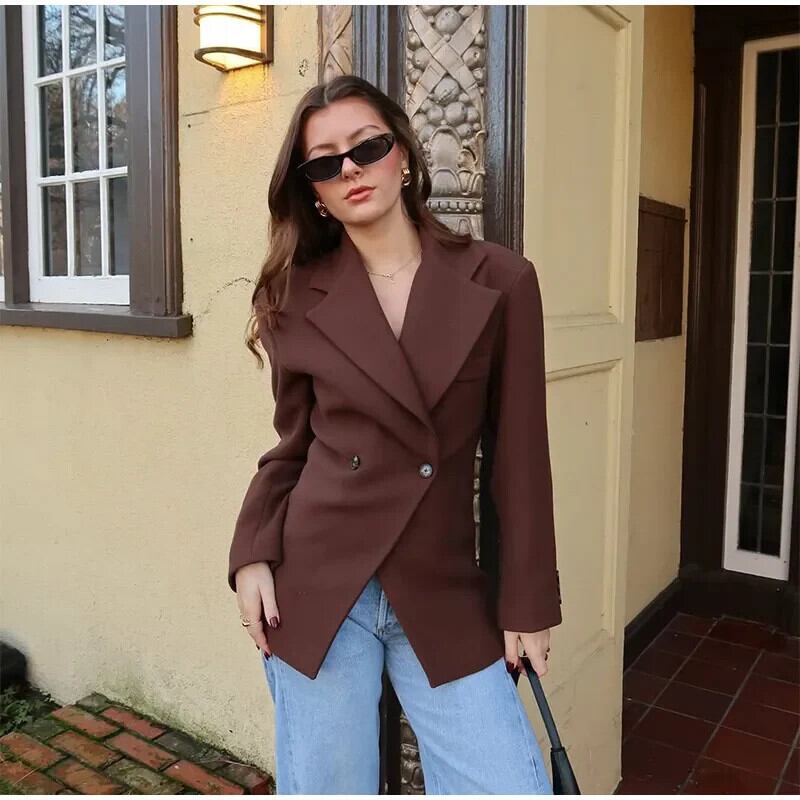 送料無料 e Doppelknopf-dünne kurze Anzugjacke für Damen mit langen Ärmeln、Taschenmantel、2025、neue Büro-Pendlerjacke、-Street-Outwear ストリート AE6677600887085333572512