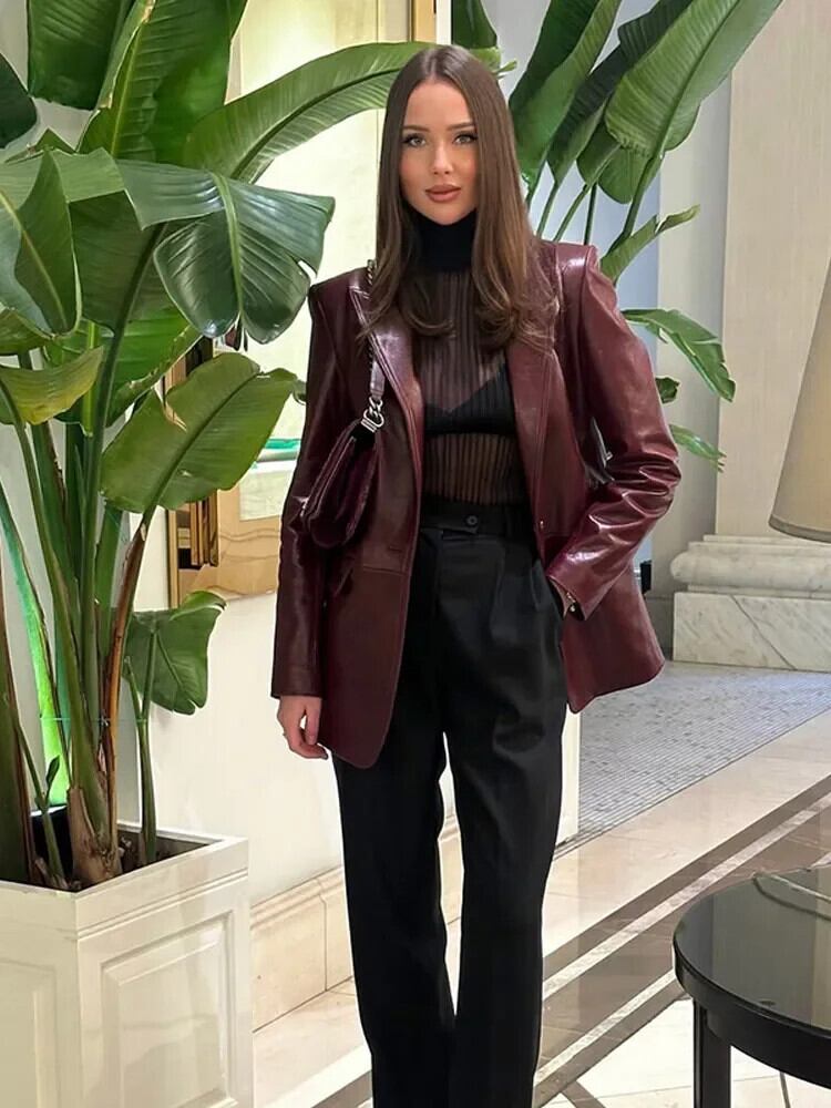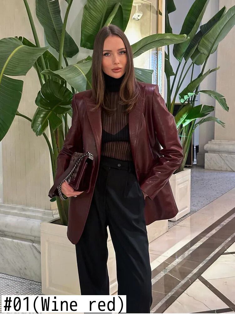 送料無料 ヴィンテージ ブルゴーニュ Pu レダー Jacke Frauen Mode Einfache Einreiher Einfarbig Jacke Frühling Weibliche street Lose Outwear ストリート ビンテージ AE6677600887099617636658