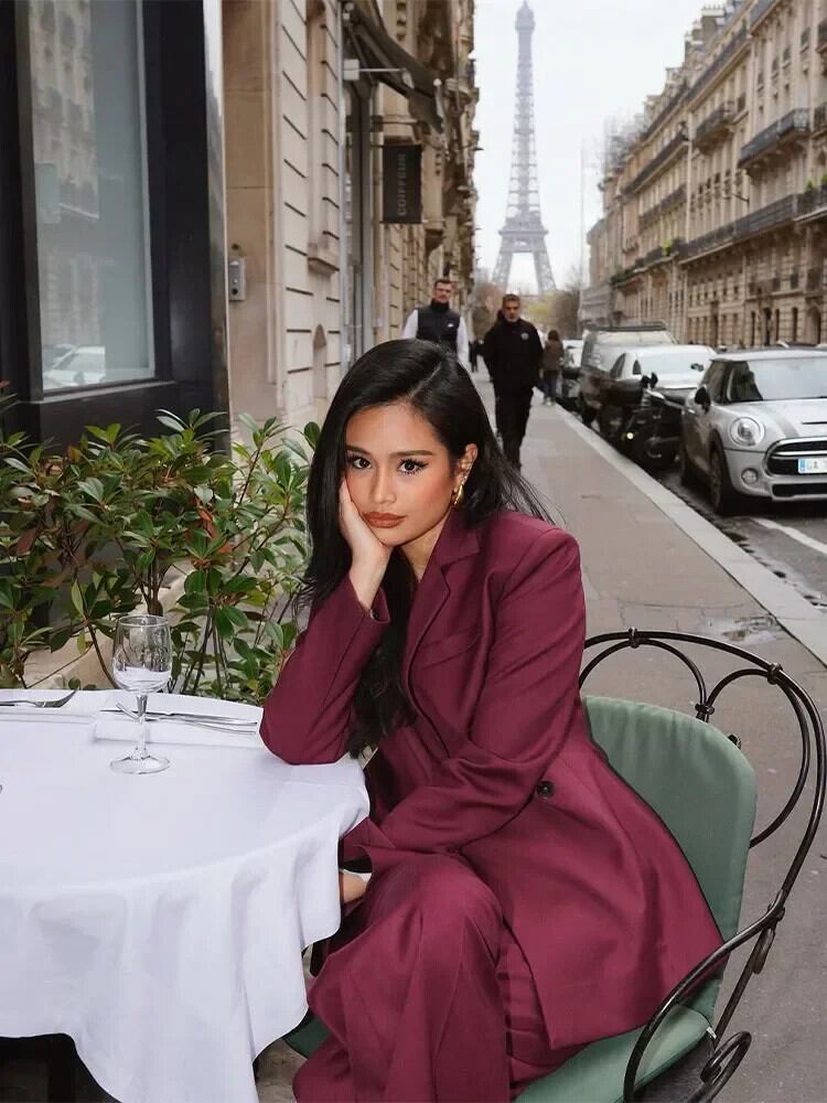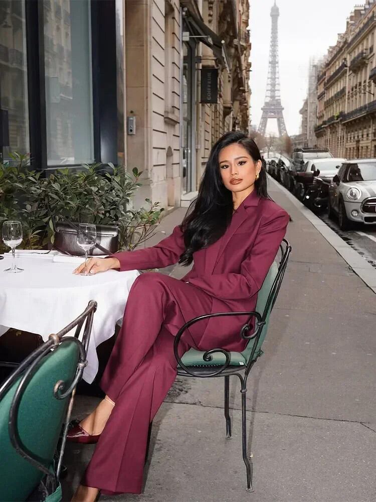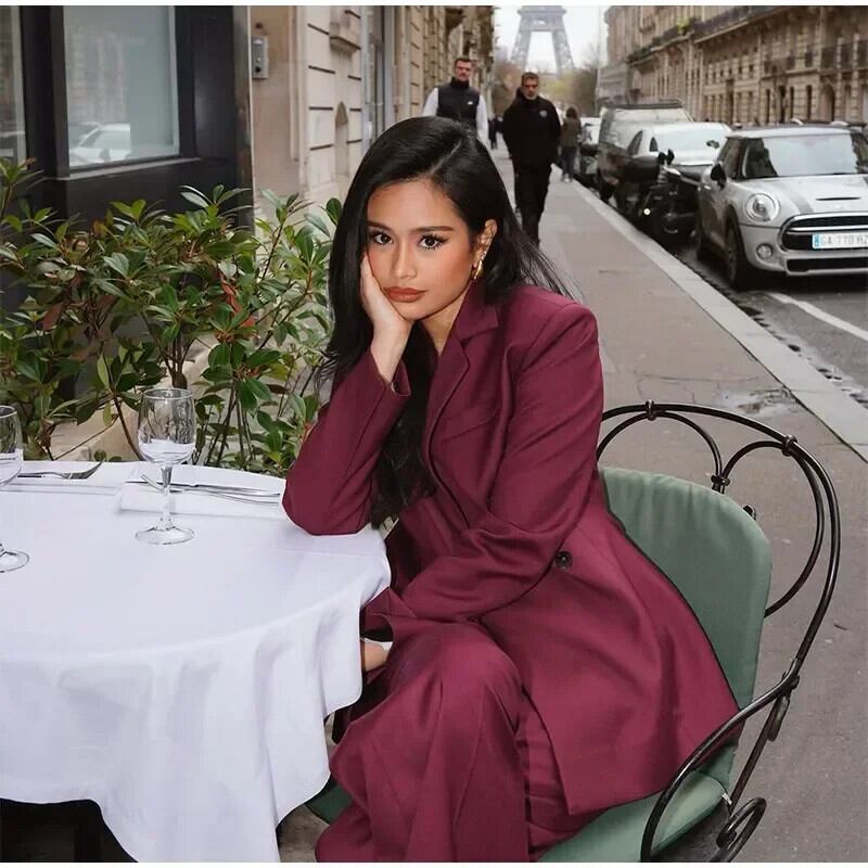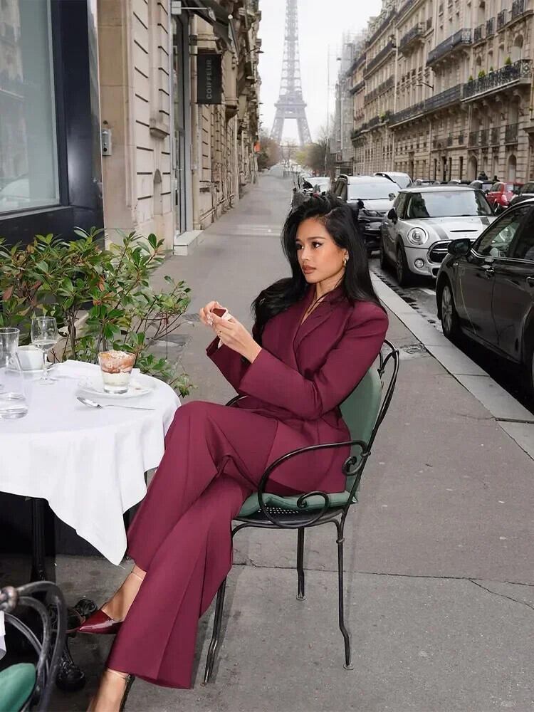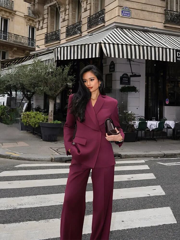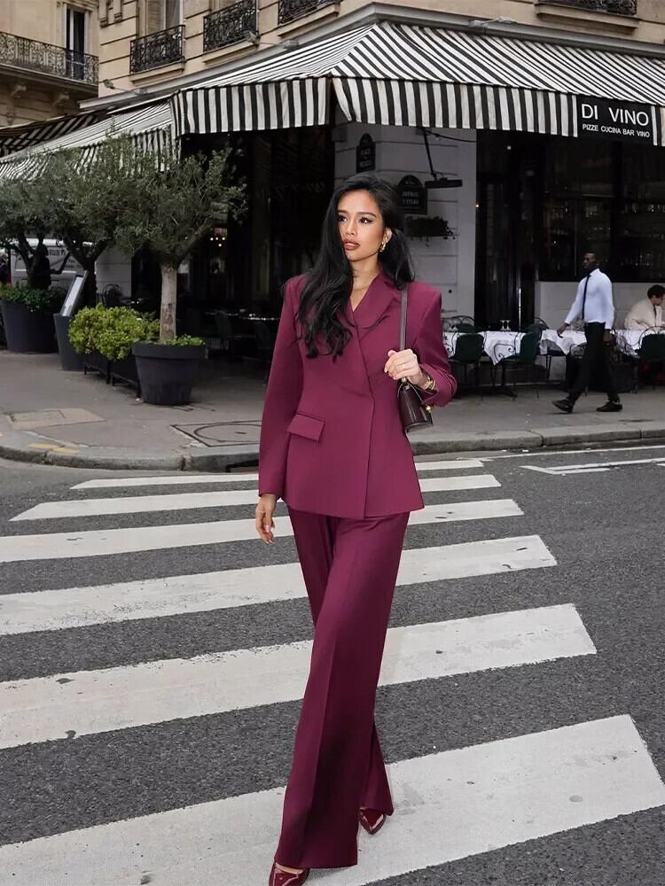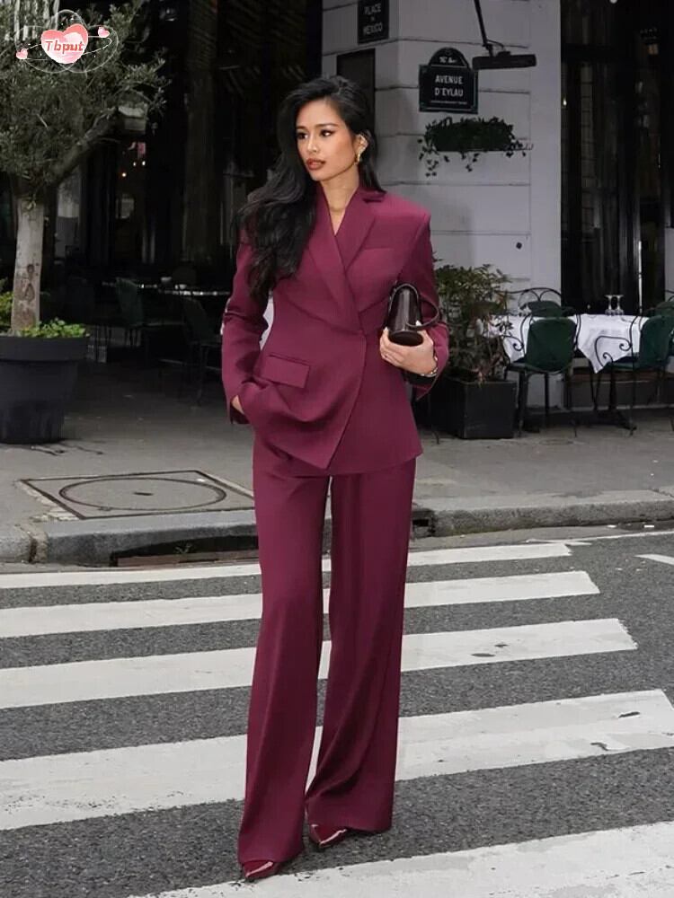 送料無料 e Frauen Weinrot Schulterpolster Anzug ジャケット セット Mode Schlanke Lange Hosen 2 Stück Anzüge 2025、Frühling Neue Frau Pendler Outwear AE6677600887062295028423